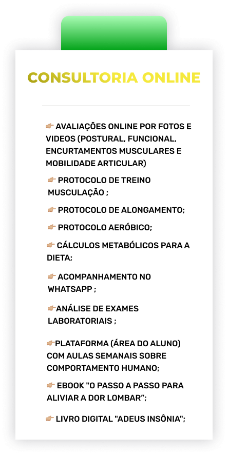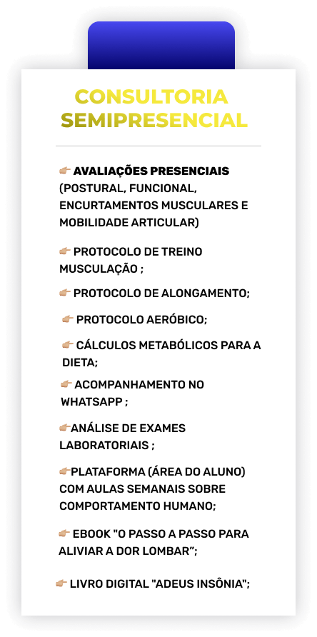 Além disso, você terá acesso à gravação da mentoria tira dúvidas sobre os exercícios indicados no livro, esse conjunto de informações e práticas certamente agregará para uma melhora na sua qualidade de vida e na sua performance.