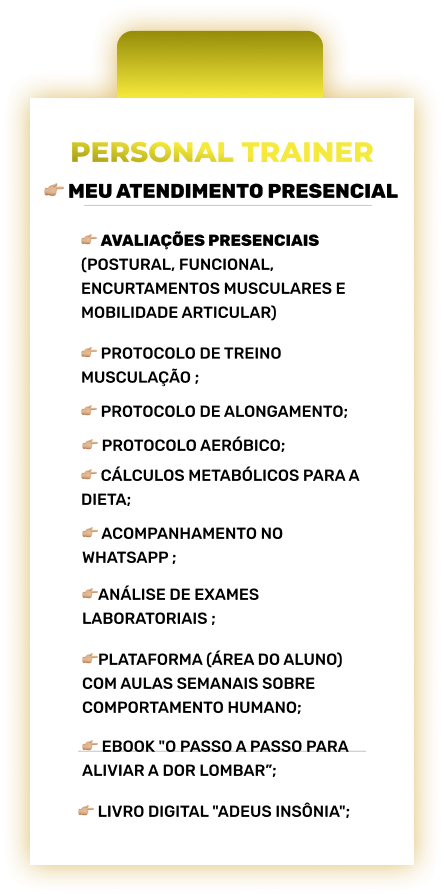 Treinador, Professor e Palestrante, especialista em EMAGRECIMENTO, HIPERTROFIA, DORES MUSCULARES E ARTICULARES, neurocomportamento, hábitos, tomada de decisão e aprimoramento contínuo.